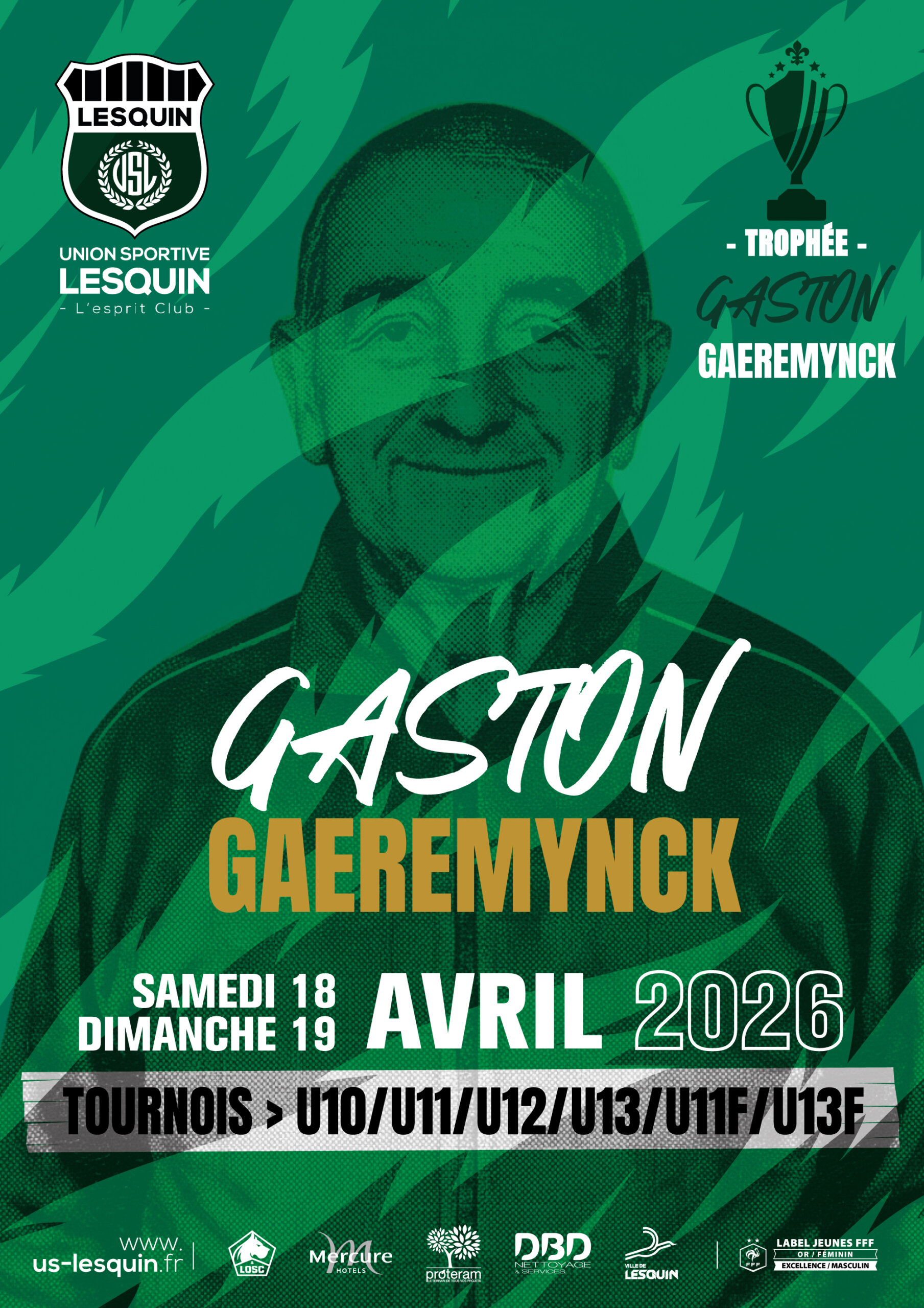 L’US Lesquin organise pour le week-end du 18 et 19 Avril 2026 son trophée Gaston Gaeremynck sur 6 catégories indépendantes cette saison de foot à 8 ( U10, U11, U12, U13, U11F & U13F ) sur les installations municipales du complexe Jean Pierre Papin de Lesquin sur 2 terrains ( Synthétique et le terrain d’honneur en pelouse naturelle ). Ce ne seront pas moins de 600 joueurs des plus belles équipes de la région qui auront l’occasion de se rencontrer pendant ces deux jours.
